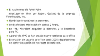 Una presentación digital es un producto multimedia creado con un programa especializado para la creación y visualización de diapositivas digitales. Cada diapositiva constituye una página en la que se puede insertar información como texto, imágenes y gráficos. PowerPoint fue inventado en 1984 y adquirido por Microsoft en 1987, desde entonces se han lanzado varias versiones que permiten crear presentaciones interactivas con efectos visuales para facilitar la comunicación de información de manera ordenada y atractiva.