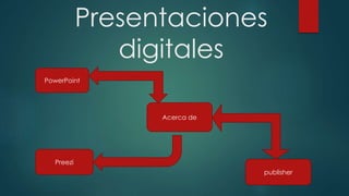 Este documento proporciona información sobre tres programas de presentaciones digitales: PowerPoint, Prezi y Publisher. PowerPoint permite crear diapositivas con texto, gráficos y videos de manera sencilla. Prezi es una alternativa dinámica a PowerPoint que utiliza un lienzo en lugar de diapositivas. Publisher se enfoca en la creación de folletos, boletines y páginas web con plantillas y herramientas de diseño.