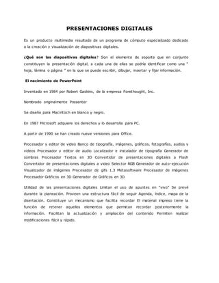 Las presentaciones digitales son el resultado de un programa de cómputo especializado para crear y visualizar diapositivas digitales. Cada diapositiva puede contener información escrita, dibujada o insertada y constituye una "página" de la presentación digital. PowerPoint fue inventado en 1984 y adquirido por Microsoft en 1987, desde entonces se han creado nueve versiones. Las presentaciones digitales permiten limitar el uso de apuntes, proveen una estructura fácil de seguir y facilitan la actualización y ampliación del contenido.