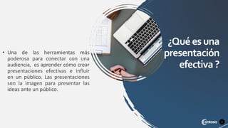 El documento trata sobre la creación de presentaciones efectivas utilizando tecnologías de la información y comunicación, enfatizando aspectos clave como contenido, diseño y evaluación. Se sugieren consideraciones prácticas antes, durante y después de la presentación para mejorar la conexión con la audiencia a través de diferentes canales de aprendizaje. Además, se destacan elementos técnicos, pedagógicos y funcionales que contribuyen al éxito de una presentación.