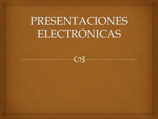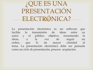 Una presentación electrónica es un software que facilita la transmisión de ideas entre un autor y su público objetivo de manera ordenada y clara. Ofrece ventajas como guiar el diseño y formato de diapositivas, permitir agregar imágenes, efectos de sonido, tablas y gráficos, y editar información fácilmente. Su desventaja es que requiere de un proyector para realizar la presentación en vivo.