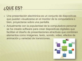 Las presentaciones electrónicas son conjuntos de diapositivas que se pueden visualizar en una computadora o proyectar, y que facilitan el diseño de presentaciones atractivas combinando elementos como imágenes, texto, sonido y video. Algunos programas populares para crear presentaciones electrónicas son Microsoft PowerPoint, OpenOffice Impress y Corel Presentation. Las presentaciones electrónicas se originaron de las diapositivas fotográficas usadas en presentaciones, pero ahora pueden incluir más elementos multimedia gracias al desarrollo de software como PowerPoint.