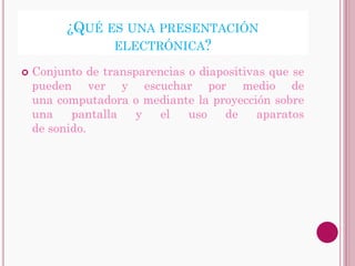 Este documento describe una presentación electrónica sobre presentaciones electrónicas. Explica que una presentación electrónica consiste en diapositivas que se pueden ver y escuchar por computadora o proyectar. Detalla algunas ventajas como mejorar la información con imágenes, gráficos y sonido, y desventajas como contener mucho texto o fallas tecnológicas. También menciona que el internet permite compartir presentaciones electrónicas para socializar conocimiento.
