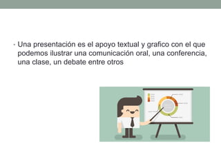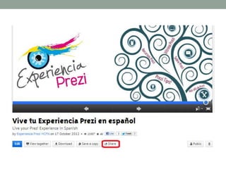 Este documento presenta diferentes herramientas para realizar presentaciones en línea. Describe sitios como Prezi, SlideShare y Wideo que permiten crear y compartir presentaciones de manera dinámica e interactiva. Prezi permite elaborar presentaciones de forma no lineal utilizando marcos que se pueden ampliar y reducir. SlideShare es un sitio para compartir presentaciones en diferentes formatos de manera pública o privada. Wideo es una plataforma en línea gratuita para crear y editar videos explicativos y presentaciones animadas.