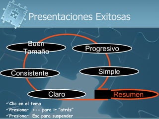 El documento proporciona recomendaciones para realizar presentaciones exitosas, incluyendo mantenerlas simples, claras, de buen tamaño y progresivas. Recomienda usar pocos colores complementarios con buen contraste, fuentes claras, números y viñetas para ordenar la información, y ser consistente en el estilo para evitar distracciones.