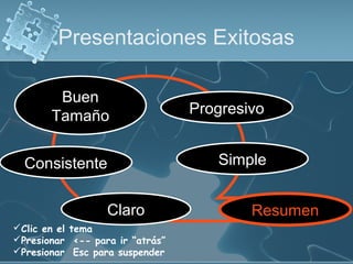 La presentación ofrece consejos para realizar presentaciones exitosas, incluyendo usar un buen tamaño de fuente, mantener la presentación simple, clara y progresiva, y ser consistente. Recomienda usar colores que contrasten, enfocarse en pocos puntos clave y utilizar gráficos y animaciones de manera simple y pertinente para reforzar el mensaje.