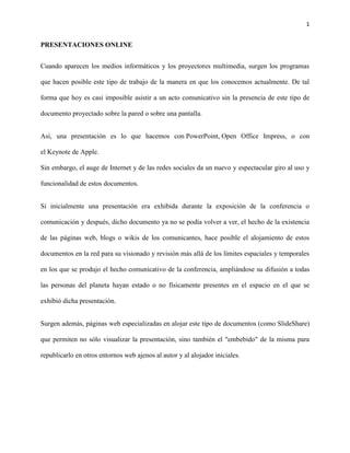El documento habla sobre las presentaciones online y cómo han evolucionado con el surgimiento de Internet y las redes sociales. Ahora es posible alojar presentaciones en páginas web y sitios especializados como SlideShare para que puedan ser vistas por cualquier persona en cualquier lugar. Estos sitios también permiten compartir y incrustar presentaciones en otros sitios web.