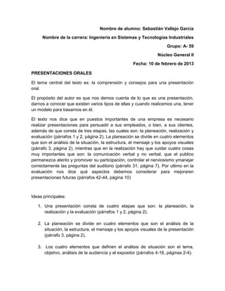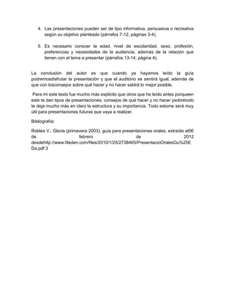 Este documento resume las principales ideas de un texto sobre presentaciones orales. Explica que una presentación consta de tres etapas: planeación, realización y evaluación. La planeación incluye cuatro elementos: análisis de la situación, estructura, mensaje y apoyos visuales. También describe los cuatro tipos de análisis de situación y tres tipos de presentaciones. Resalta la importancia de conocer la audiencia.