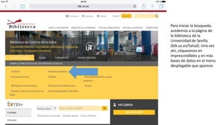 El documento describe los pasos para realizar una búsqueda en la base de datos Dialnet sobre la influencia del estilo de vida en el sobrepeso y la obesidad en adultos y ancianos. Incluye definir palabras clave, operadores booleanos y filtrar 68 resultados. Explica cómo acceder al texto completo de un documento o comprobar el acceso a través de la biblioteca cuando el documento pertenece a una revista de pago.