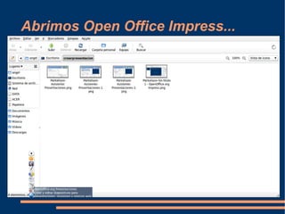 Este documento proporciona instrucciones paso a paso para crear una presentación en OpenOffice Impress, incluyendo cómo insertar imágenes, diapositivas y enlaces. Explica cómo guardar la presentación en formato .odp y exportarla a PDF para que se vea igual en todos los ordenadores. El documento está bajo una licencia Creative Commons que permite copiar, distribuir y hacer obras derivadas siempre que se reconozcan los créditos.