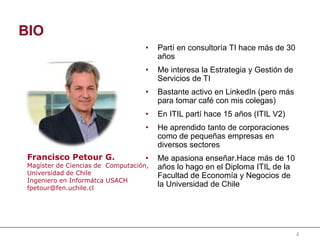 El documento es una presentación sobre la gestión del catálogo de servicios de TI, resaltando su importancia para mejorar la comunicación y eficiencia entre organizaciones de TI y negocios. Se discute la evolución de las organizaciones de TI de ser meramente tecnológicas a enfocarse en el valor del negocio, enfatizando la necesidad de catálogos de servicios claros y bien definidos. Las organizaciones deben comprender y comunicar claramente el costo y el valor de sus servicios para fortalecer la confianza con los usuarios y la dirección empresarial.