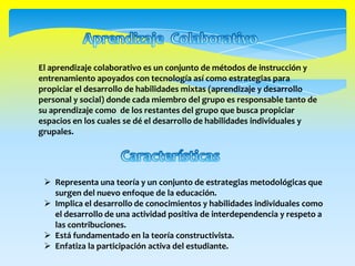 El documento describe el aprendizaje colaborativo, un conjunto de métodos de instrucción apoyados por tecnología que busca fomentar el desarrollo de habilidades individuales y de grupo. Implica que los estudiantes sean responsables de su propio aprendizaje y del de los demás, y enfatiza la participación activa, la interdependencia positiva, la interacción y las contribuciones individuales. Tiene ventajas como estimular habilidades personales y disminuir sentimientos de aislamiento, pero también riesgos como depender de la