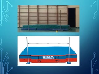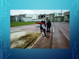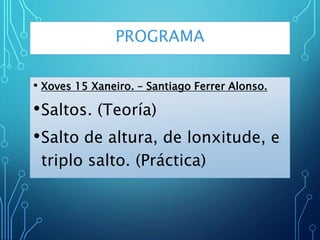 Este documento presenta información sobre los saltos en atletismo, incluyendo salto de longitud, triple salto, salto de altura y salto con pértiga. Explica las fases fundamentales de cada salto (carrera, batida, vuelo y caída) y aspectos a tener en cuenta en la adaptación para cada edad. También incluye un programa práctico con ejercicios de calentamiento, progresiones técnicas y ejercicios específicos para cada salto.