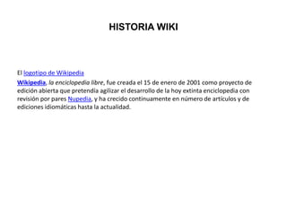 El documento describe la historia y características de Wikipedia como un proyecto de edición colaborativa que comenzó en 2001, permitiendo la creación y modificación de contenido por múltiples usuarios. Se analizan las ventajas, como la actualización instantánea y el fomento del aprendizaje cooperativo, así como desventajas como la falta de supervisión que puede llevar a la difusión de información inexacta o vandalismo. Además, se mencionan tipos de proveedores de servicios relacionados con wikis y su uso en el aprendizaje.