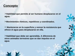 Este documento describe la natación. Explica que es una habilidad que permite al ser humano desplazarse en el agua a través de movimientos rítmicos y coordinados. Tiene objetivos utilitarios, educativos, higiénicos y competitivos. Explora la historia de la natación en la antigua Grecia y Roma y su resurgimiento en el siglo XX. Finalmente, detalla los estilos de natación - crol, mariposa, pecho y espalda - y los materiales básicos usados como gorros, gafas