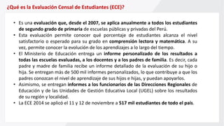 La Evaluación Censal de Estudiantes 2014, aplicada a más de 517,000 estudiantes en Perú, mostró un aumento notable en la comprensión lectora y matemática, con mejoras del 11 y 9 puntos porcentuales respectivamente en comparación con 2013. La entrega de informes personalizados a padres y escuelas permite un mejor seguimiento del rendimiento estudiantil, contribuyendo a los esfuerzos por mejorar la educación en el país. Este progreso se atribuye a la oportuna contratación de docentes, entrega de materiales educativos y programas de apoyo a estudiantes con dificultades de aprendizaje.