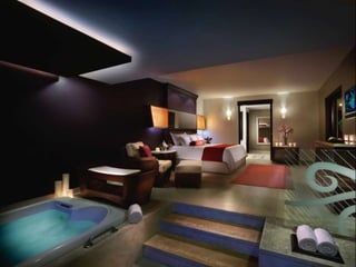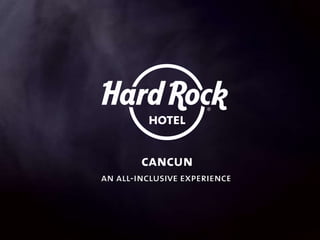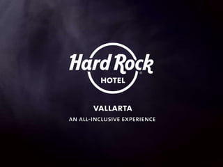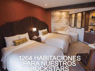 Este documento promociona las instalaciones y servicios de un hotel Hard Rock. Ofrece una variedad de habitaciones lujosas, incluyendo suites temáticas de rock and roll. También destaca sus numerosos restaurantes, bares y áreas recreativas para todos los gustos y edades. Promete una experiencia inmersiva en la cultura rockera durante toda la estancia.