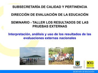 1) El documento presenta los resultados de las pruebas externas aplicadas en 2010, incluyendo la distribución de estudiantes por rangos de puntaje, promedios, desviación estándar y comparativos históricos.