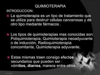 La quimioterapia es un tratamiento utilizado para destruir células cancerosas y otras enfermedades mediante fármacos. Existen diferentes tipos de quimioterapias como la poliquimioterapia y la quimioterapia adyuvante. Aunque tiene beneficios, la quimioterapia también puede causar efectos secundarios como náuseas, vómitos y fatiga que generalmente desaparecen una vez finalizado el tratamiento, pero a veces pueden ser permanentes y dañar órganos.