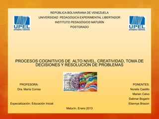 Este documento presenta información sobre procesos cognitivos de alto nivel como la creatividad, toma de decisiones y resolución de problemas. Describe que la creatividad implica producir cosas nuevas y originales, y define características como fluidez, flexibilidad y originalidad. Explica que la toma de decisiones consiste en elegir entre alternativas para resolver una situación, y presenta las etapas del proceso de decisión. Finalmente, detalla que la resolución de problemas implica superar obstáculos mediante el pensamiento, y las etapas de este