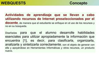 El documento describe las características principales de una webquest. Una webquest es una actividad de aprendizaje guiada que utiliza recursos de Internet seleccionados por el docente. El estudiante debe enfocarse en usar los recursos para responder una pregunta central y desarrollar su conocimiento individualmente y en grupo. Las mejores webquests motivan a los estudiantes a ver relaciones temáticas más ricas y reflexionar sobre sus propios procesos de aprendizaje.