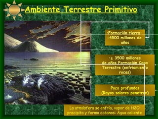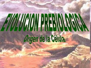El documento describe la evolución prebiológica desde la formación de la Tierra hace 4500 millones de años hasta la aparición de las primeras células. Moléculas orgánicas simples se sintetizaron en una "sopa primitiva" hace 4600 millones de años. Protobiontes con proteínas y ácidos nucleicos aparecieron hace 3800 millones de años. Las primeras células procariotas capaces de autoreproducirse surgieron hace aproximadamente 3000 millones de años.