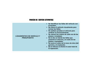 El documento presenta los pasos del proceso de servicio automotriz. Estos incluyen 1) la recepción del vehículo, 2) el diagnóstico de fallas y presupuesto, 3) la compra de piezas, 4) la entrega del vehículo reparado al cliente. Se proveen formatos detallados para cada paso del proceso con el fin de documentar la información del cliente, el vehículo, las fallas encontradas y el costo total de la reparación.