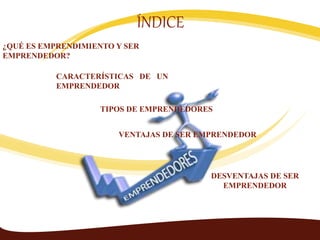 Este documento describe el emprendimiento y las características de los emprendedores. Define el emprendimiento como la aptitud para emprender nuevos retos y proyectos. Explica que un emprendedor identifica oportunidades y organiza los recursos para aprovecharlas. Luego detalla las características de los emprendedores como la pasión, visión, determinación y creatividad. También describe diferentes tipos de emprendedores como los visionarios, los que emprenden por necesidad e inversionistas. Finalmente, resume algunas ventajas como la independencia y desvent