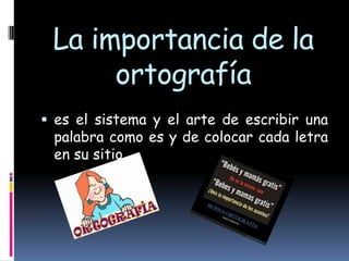 Este documento presenta una introducción a la ortografía en español. Explica que la ortografía se refiere al uso correcto de las letras de acuerdo con las convenciones establecidas para una lengua. Además, detalla que la ortografía española moderna comenzó a codificarse en el siglo 18 por la Real Academia Española para estandarizar las reglas de escritura y superar las inconsistencias previas. Finalmente, distingue entre la ortografía general, la ortografía técnica para símbolos y la