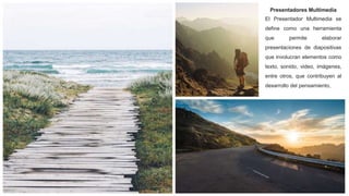 Un presentador multimedia es una herramienta que permite crear presentaciones con elementos como texto, imágenes, video y sonido para mejorar el aprendizaje y la comunicación. Los programas de presentación incluyen un editor, la capacidad de insertar imágenes y un sistema para mostrar el contenido de forma secuencial. PowerPoint fue uno de los primeros programas de presentación y actualmente es parte de Microsoft Office, mientras que Apple lanzó Keynote en 2003.