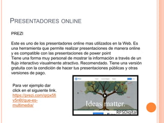 Este documento describe diferentes herramientas de presentación multimedia como Prezi, SlideShare, Google Docs y Zoho. Explica brevemente las características y ventajas de cada una. También incluye definiciones de hipertexto e hipervínculo y un mapa conceptual sobre el tema de multimedia.