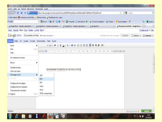 Google Docs permite crear, compartir, subir y descargar documentos de texto, presentaciones y hojas de cálculo desde cualquier dispositivo a través de una cuenta de Google. Los usuarios pueden crear nuevos documentos, presentaciones, hojas de cálculo, formularios y dibujos o cargar archivos existentes para compartirlos con otros.