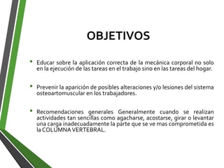 Este documento trata sobre la higiene postural y cómo mantener una buena postura para prevenir lesiones. Explica qué es la higiene postural, los factores que causan malas posturas, cómo corregirlas, y ofrece recomendaciones sobre mantener una buena postura en actividades laborales y del hogar para proteger la columna vertebral.