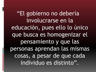 El documento presenta varias nuevas teorías educativas. Sugiere que el gobierno no debería involucrarse en la educación porque homogeniza el pensamiento. También dice que aunque el aprendizaje sigue siendo similar a través de los tiempos, el rol del maestro debe evolucionar a uno de mentor. Otra teoría es que la educación sucede cuando el estudiante está dispuesto a aprender más allá de quien enseña, y requiere concentración y curiosidad del estudiante.