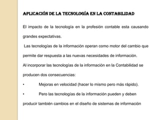 Este documento describe el impacto de la tecnología en la contabilidad. Al incorporar las tecnologías de la información en la contabilidad, se producen mejoras en la velocidad de los procesos y cambios en los sistemas de información contable. Las tecnologías permiten obtener balances y cuentas en tiempo real, depositar cuentas en registros mercantiles por Internet, liquidar impuestos por Internet, y enviar facturas por intercambio electrónico de información.