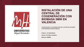 El proyecto aborda la gestión legal para instalar una central de cogeneración de 5 MW en Valencia, utilizando biomasa como combustible renovable, para reducir la dependencia de combustibles fósiles. Se identifican los tipos de biomasa, métodos de conversión en energía, y se presenta un caso real de instalación, que incluye la clasificación del suelo y la legislación relevante. Finalmente, se describen los trámites y autorizaciones necesarias para llevar a cabo la instalación.