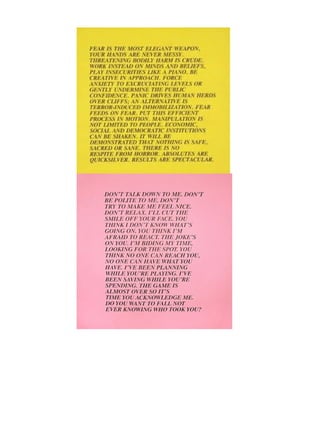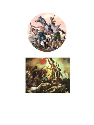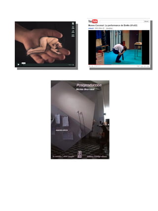 Este documento presenta varias citas y obras de arte relacionadas con temas como los rituales de iniciación, la tensión entre arte y activismo, la manipulación cultural, y la mirada joven sobre un mundo en constante cambio. Incluye referencias a autores como Bataille, Debord, Rosler y Brea.