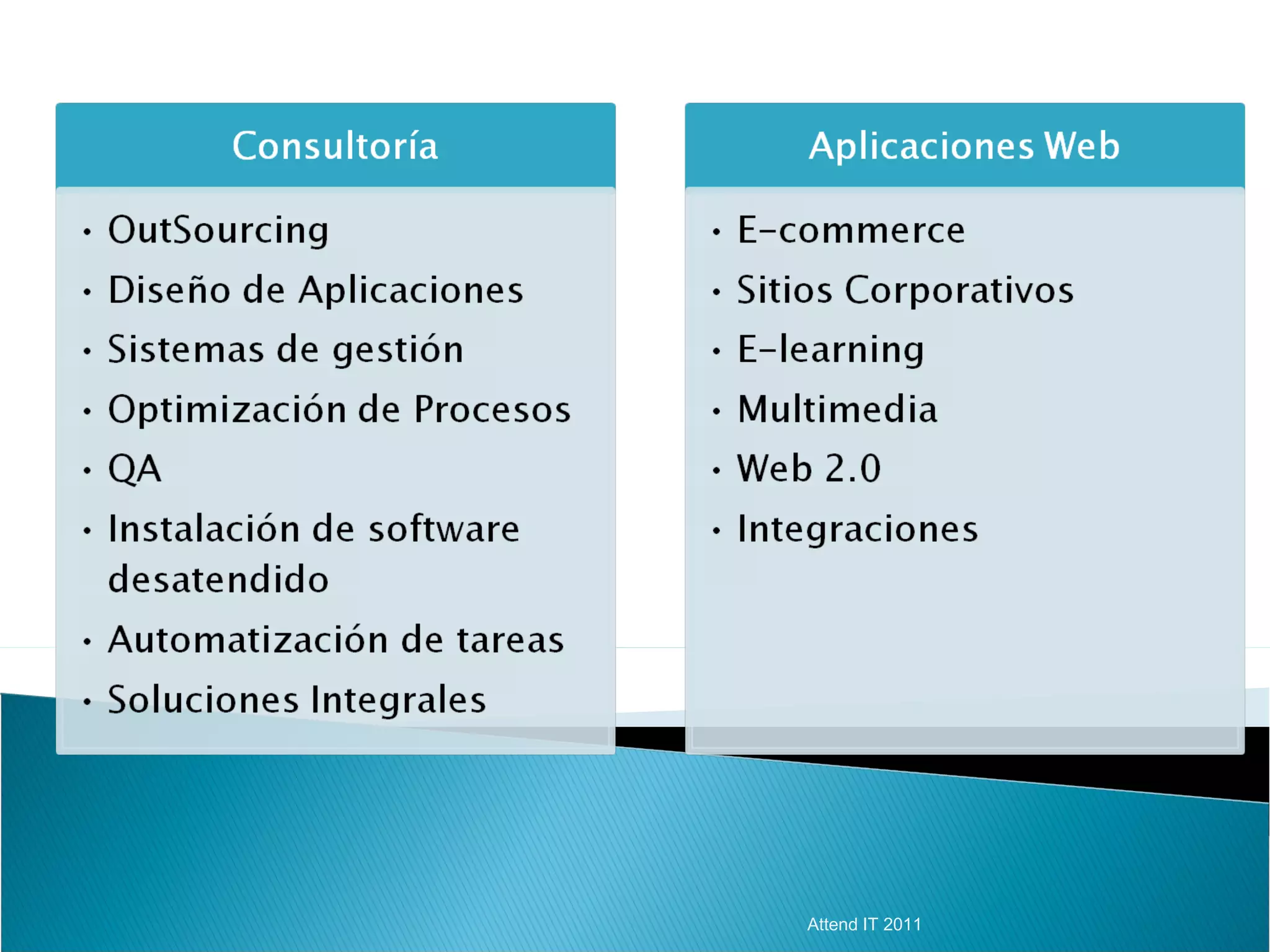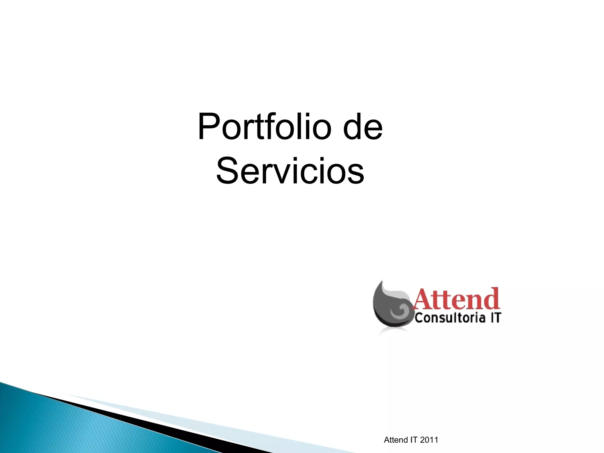 Este documento presenta los servicios de consultoría en tecnologías de la información de Attend IT, incluyendo outsourcing, desarrollo y mantenimiento de software, infraestructura, diseño de aplicaciones, sistemas de gestión, project management, calidad de software, e-commerce, sitios web corporativos, e-learning, multimedia, web 2.0, sistemas de gestión de contenido y automatización de tareas. La empresa ofrece soluciones utilizando metodologías probadas y recursos altamente capacitados.