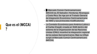 El Mercado Común Centroamericano (MCCA) fue establecido en 1960 e incluye a El Salvador, Honduras, Nicaragua y Costa Rica, promoviendo la integración económica y el comercio regional. Desde su creación hasta 2014, el comercio regional creció a una tasa promedio del 11,1%, superando el crecimiento de exportaciones hacia mercados externos. El MCCA mantiene relaciones comerciales predominantes con Estados Unidos, México y Canadá, que representan más del 36% de sus exportaciones.
