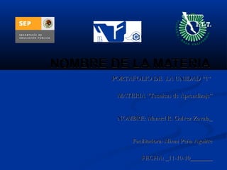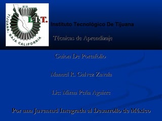 Este documento presenta el portafolio de la unidad 1 de la materia Técnicas de Aprendizaje del estudiante Manuel R. Galvez Zavala. Incluye su filosofía personal, las competencias generales y específicas de la unidad relacionadas con la evaluación de estrategias de aprendizaje y el desarrollo de competencias como egresado de bachillerato y estudiante de educación superior.