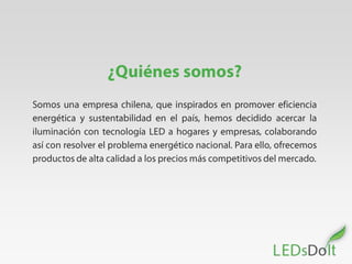 Renovo Chile Ingeniería Limitada es una compañía que se enfoca en mejorar la eficiencia energética en Chile a través de proyectos de iluminación que reemplazan lámparas halógenas de 100W por opciones más eficientes. La compañía trabaja para lograr un Chile más eficiente trabajando juntos en proyectos de iluminación.