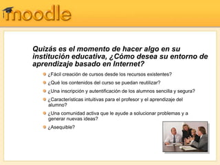 Este documento introduce Moodle, un sistema de gestión de aprendizaje abierto y gratuito. Moodle ofrece una plataforma modular y dinámica para crear cursos online con características como foros, cuestionarios, tareas y calificaciones. El documento describe cómo los profesores pueden usar fácilmente los módulos de Moodle para diseñar cursos interactivos, y cómo los estudiantes pueden acceder a los cursos de forma flexible las 24 horas del día desde cualquier lugar.