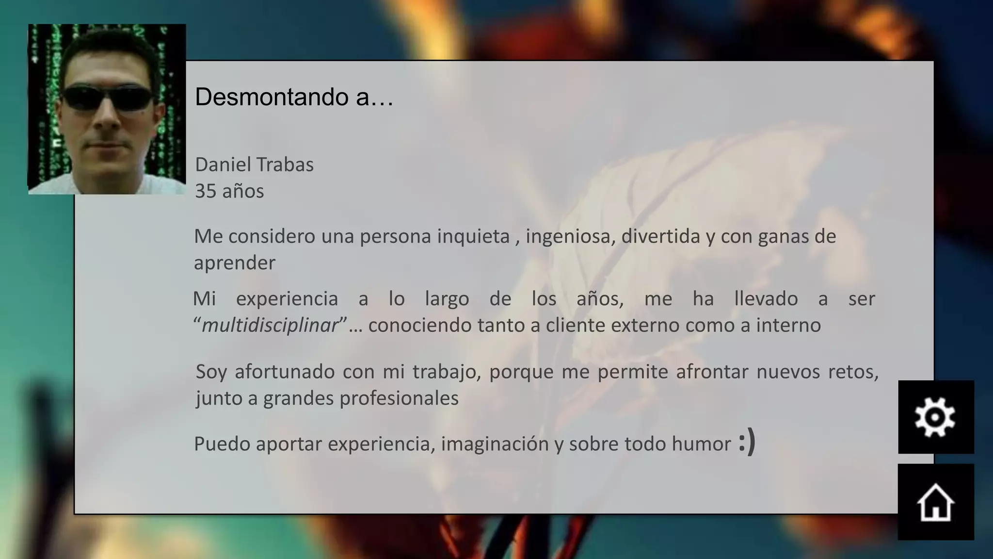 Este documento presenta la trayectoria profesional de Daniel Trabas desde 1997 hasta la actualidad. Comenzó su carrera en soporte técnico y luego se especializó en soporte de internet, B2B, investigación y desarrollo, sistemas, prevención, bases de datos, gestión, negocios inteligentes e integración. A lo largo de los años ha adquirido una amplia experiencia multidisciplinar trabajando en diferentes áreas tecnológicas.