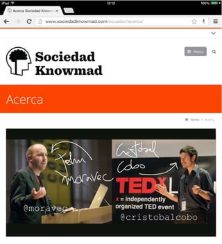 El documento detalla las reglas y la dinámica de un taller sobre innovación y educación, donde los participantes deben estar preparados y usar ropa cómoda. Se establece un hashtag (#knowmad) para la interacción en redes sociales y se plantean preguntas para la discusión en grupo sobre aprendizaje invisible y habilidades necesarias para formadores en el siglo XXI. Se recomienda a los asistentes leer un libro previamente y llevar artículos tecnológicos.
