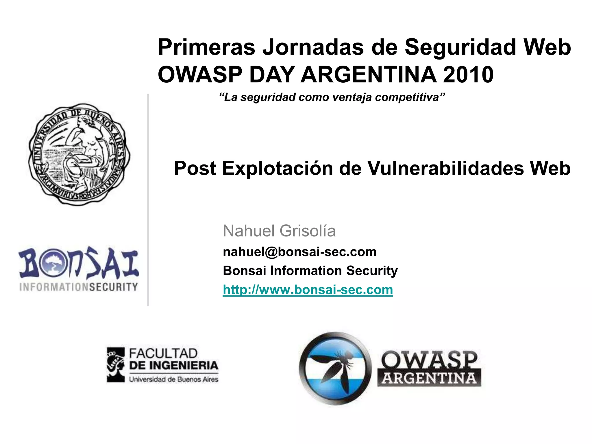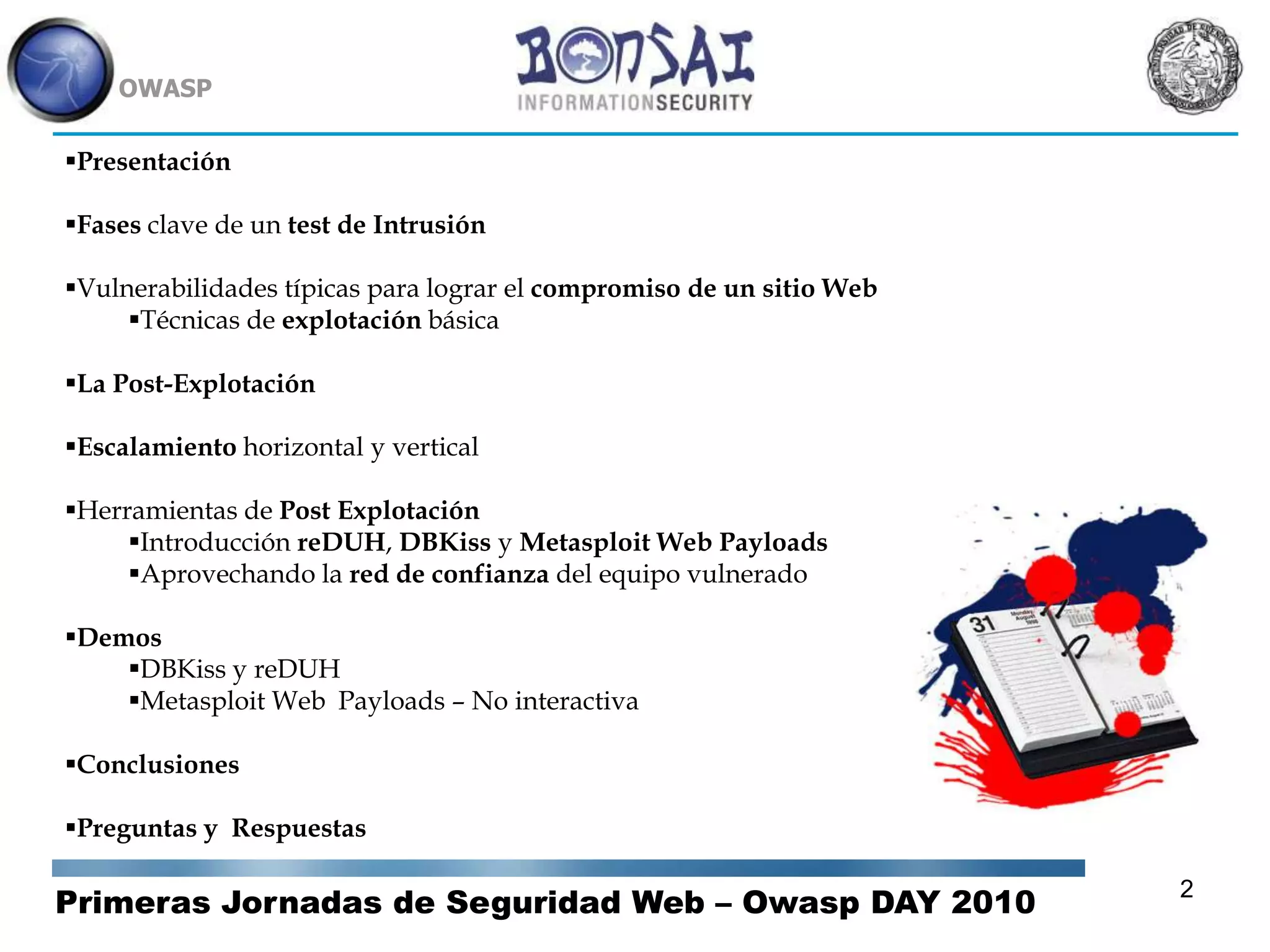 El documento presenta las fases de post-explotación luego de comprometer un sitio web, incluyendo escalamiento horizontal y vertical, herramientas como DBKiss, reDUH y Metasploit Web Payloads, y técnicas como aprovechar la red de confianza del equipo vulnerado. El orador explica conceptos clave de post-explotación y realiza demostraciones prácticas de herramientas.