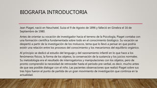 Jean Piaget fue un psicólogo suizo que desarrolló una teoría constructivista del desarrollo cognitivo infantil. Propuso que los niños pasan por cuatro etapas distintas en el desarrollo de su pensamiento: la etapa sensoriomotora, la etapa preoperacional, la etapa de las operaciones concretas y la etapa de las operaciones formales. En cada etapa, los niños desarrollan nuevas habilidades cognitivas a través de la interacción con el mundo que les rodea. Piaget también estudió los