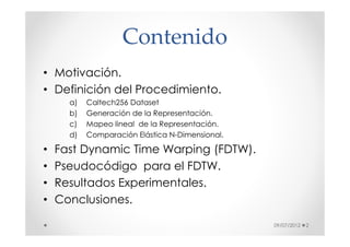 El documento presenta un método no supervisado para la búsqueda de similitud en imágenes utilizando comparación elástica n-dimensional y el algoritmo Fast Dynamic Time Warping (FDTW). El procedimiento, probado en un sub-set del dataset Caltech256, muestra resultados prometedores en la clasificación de imágenes sin necesidad de entrenamiento previo. Las conclusiones destacan la precisión del método y su utilidad para buscar similitudes en grandes conjuntos de imágenes no anotadas.