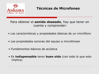 El documento proporciona consejos sobre técnicas de microfoneo, incluyendo que la ubicación del micrófono depende del sonido deseado y las características del instrumento, y que se debe usar el menor número de micrófonos posible para minimizar ruido e interferencias. También recomienda colocar los micrófonos lo más cerca posible de los instrumentos y utilizar micrófonos con respuesta de frecuencia adecuada al rango del instrumento.