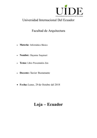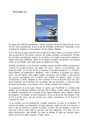 Este documento resume los principios del enfoque Zen sobre las presentaciones. Explica que el Zen no es un método estricto sino una filosofía para hacer presentaciones de forma más simple, visual y natural. Resalta algunos usos clave de Presentation Zen como mantener las diapositivas simples con poco texto y gráficos, limitar las animaciones y transiciones, usar buenos gráficos y video, y revisar la lógica del flujo en el clasificador de diapositivas.
