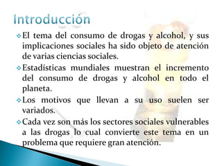 El documento discute el problema creciente del consumo de drogas y alcohol, especialmente entre los jóvenes. Explica que debemos educar mejor a las generaciones futuras y que las familias y escuelas deben trabajar juntas para prevenir el uso de sustancias. También destaca que los cerebros de los adolescentes son más vulnerables a los efectos dañinos del alcohol y las drogas.